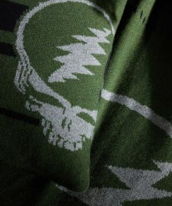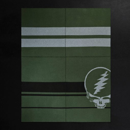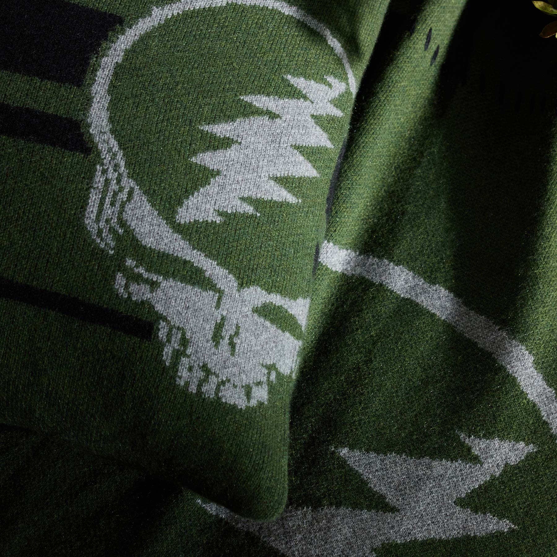 Indulge in luxury with our Grateful Dead Cashmere Blanket. Crafted from double-faced cashmere knit jacquard, this premium throw features a reversable design flaunting the iconic emblem of the band, the Grateful Dead skull. This blanket is further accentuated by a distinctive patchwork detail, framed by an exaggerated blanket stitch. Designed as a collectible piece and the perfect addition to elevate any living space year-round, whether draped over a sofa or folded at the foot of a bed.