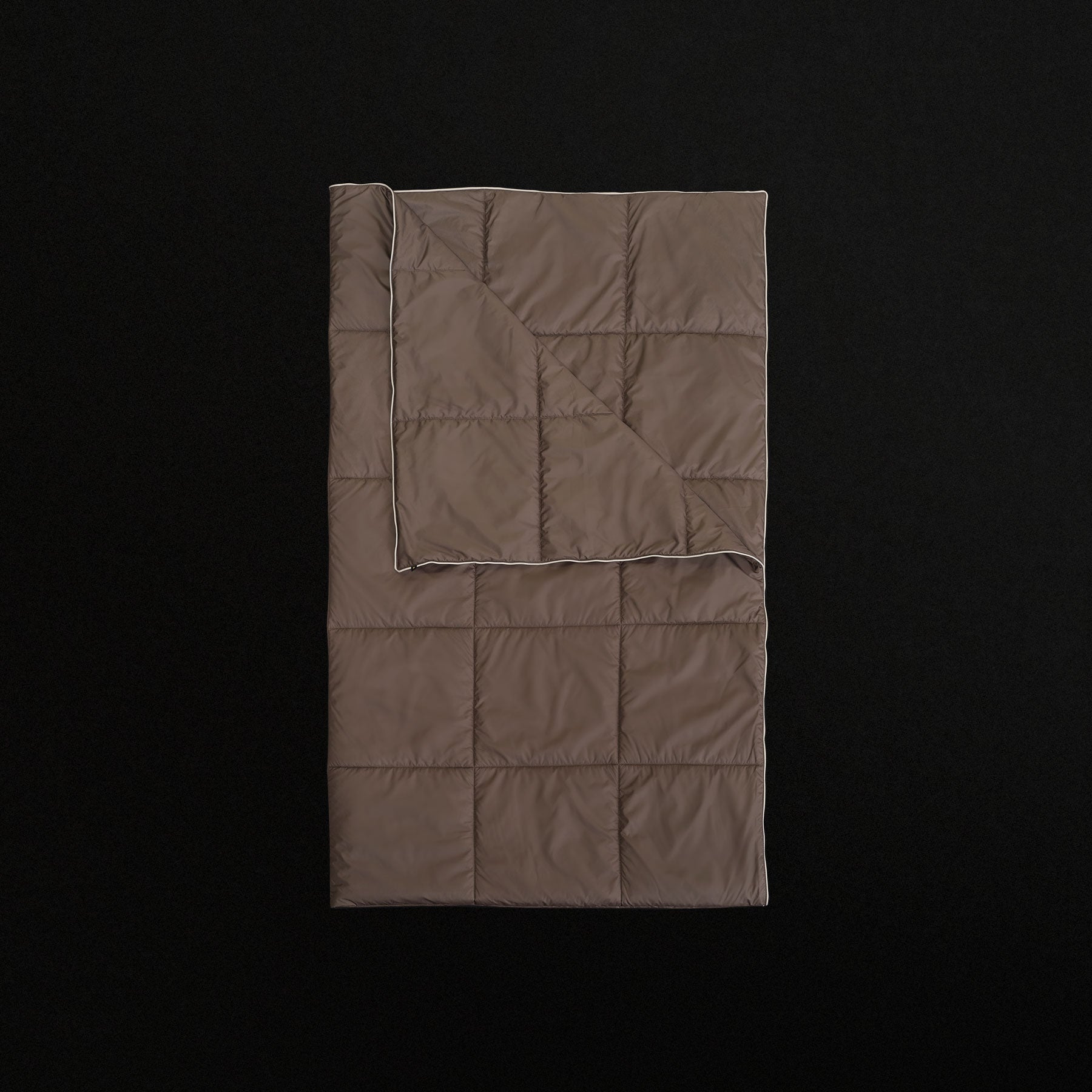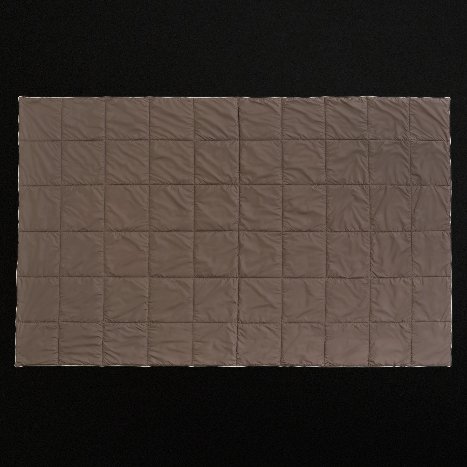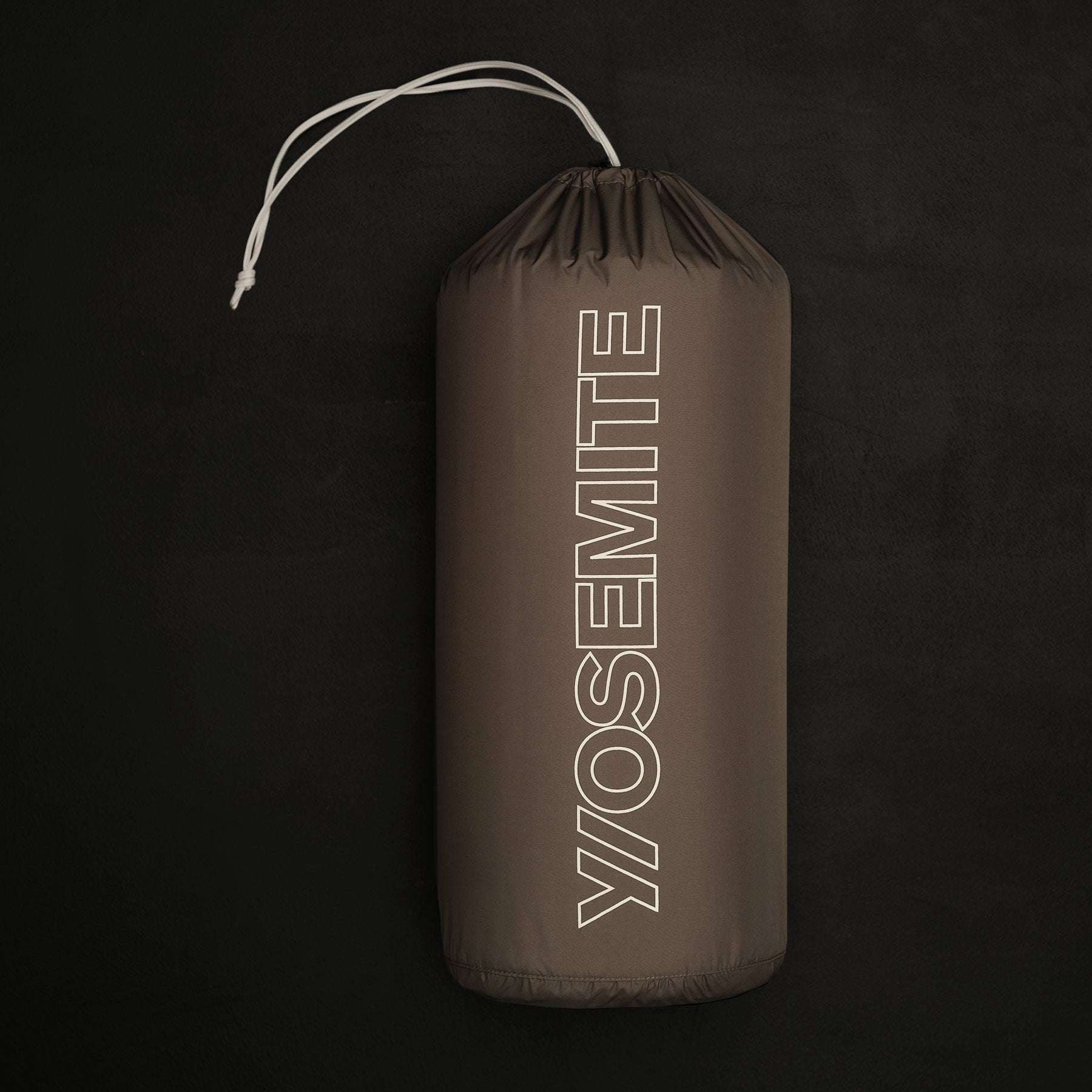 Y/OSEMITE Quilted Blanket with bag. Quilted stitching throughout the blanket. Blanket has a lightweight, compactable synthetic fill. Fill is 55% Polyester, 45% Polypropylene. Contrast color piping details on all edges. Blanket comes with a self-fabric bag. Contrast color drawcord Y/OSEMITE screen printed on bag.