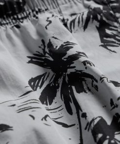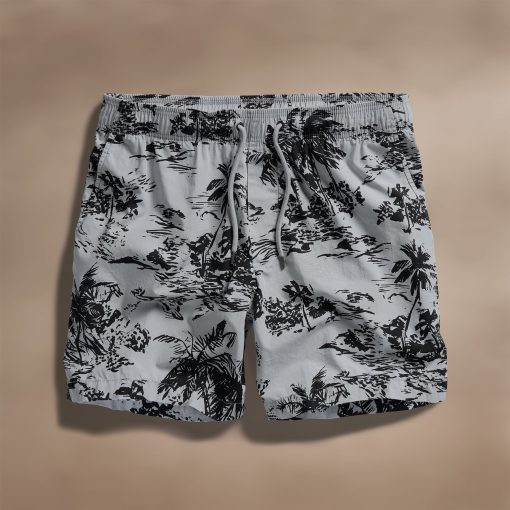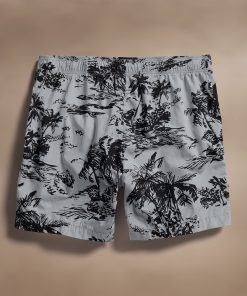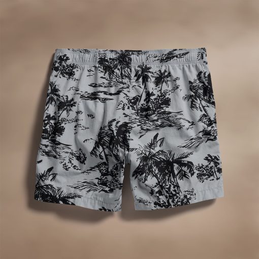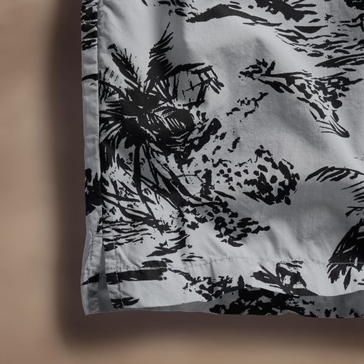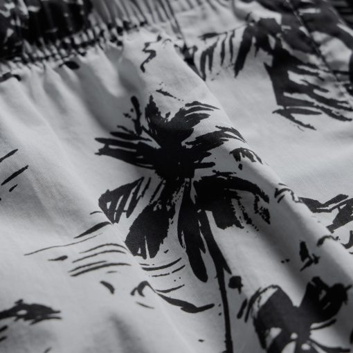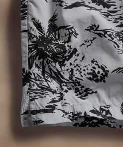 Island poplin short with an overdyed print. Fold over elasticized waistband with drawcord, two patch pockets
