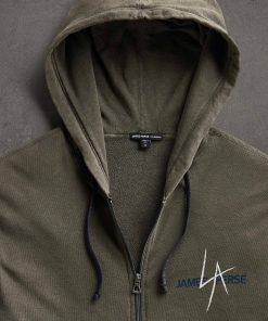 JP x LA relaxed fit French Terry Zip Hoodie with drawcord hood, full zip closure, full-length sleeves and kangaroo pockets. Features graphics of James Perse x Local Authority on left chest, large-scale Local Authority on back and Los Angeles on right sleeve. Our lightweight Supima cotton terry is garment dyed and treated for softness, yielding a lived-in feel.