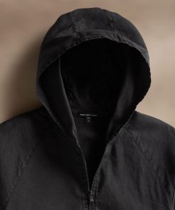 Our Linen Blend Zip Front Hoodie is made of an Italian Linen Cotton blend fabric. This elevated fabric has stretch and drape with subtle texture. Meant to be styled with the jogger – MLIM1437. Style details include a full zip placket, kangaroo pockets, raglan sleeves, and an elasticized hemline and sleeve cuffs. Garment Dyed. Relaxed fit