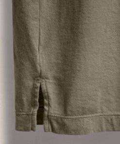 Japanese lotus jersey. Fabric is incredibly smooth, ultra soft with satin like hand feel. Collar in contrast ribbed knit and placket with buttons. Side splits.