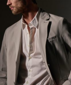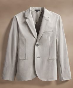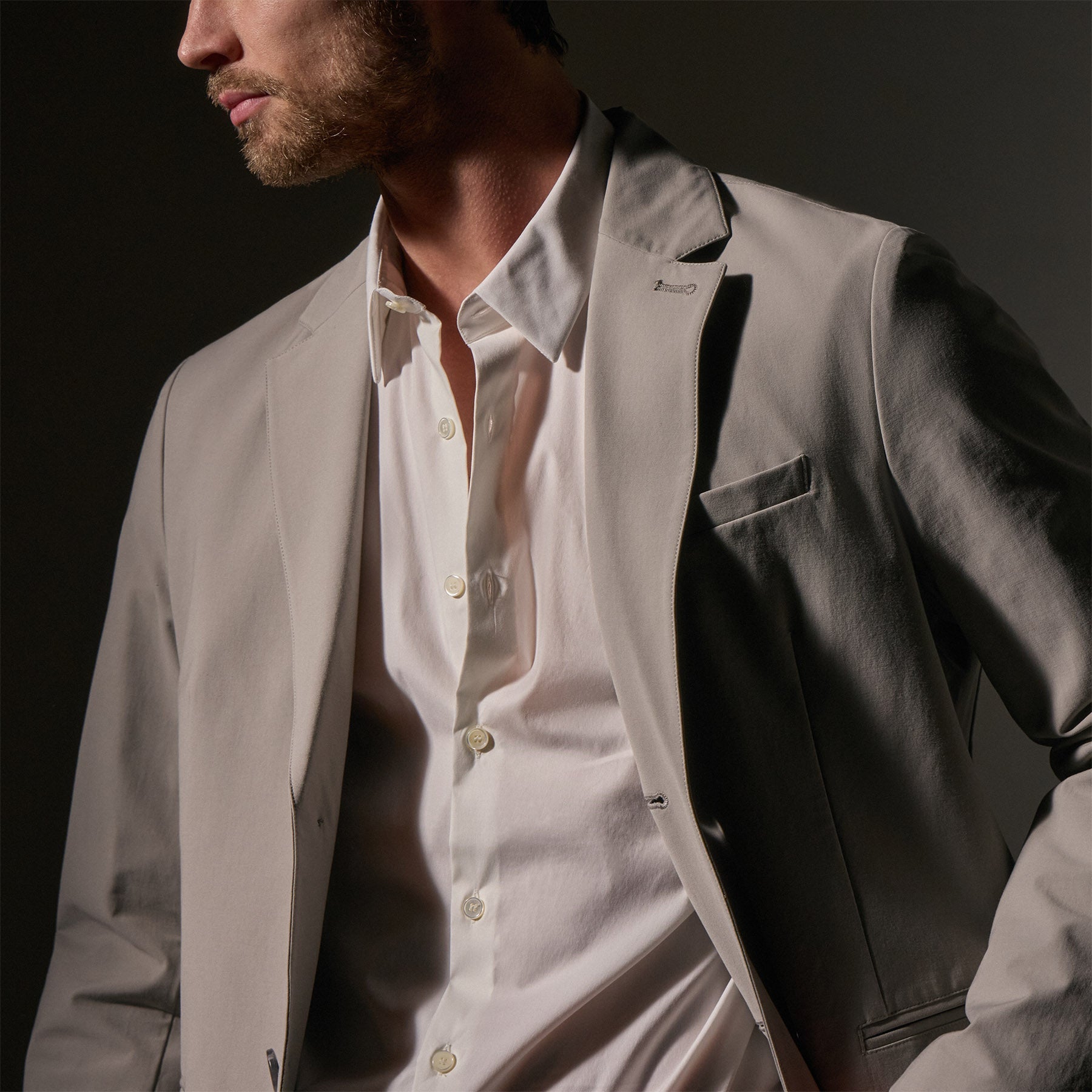 Our Performance Blazer is made using a high performance stretch cotton blend Italian fabric. Style details include notch collar, front patch pockets, chest welt pocket, button closure, clean finish hemline, half lined.
