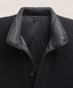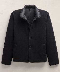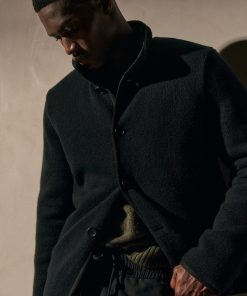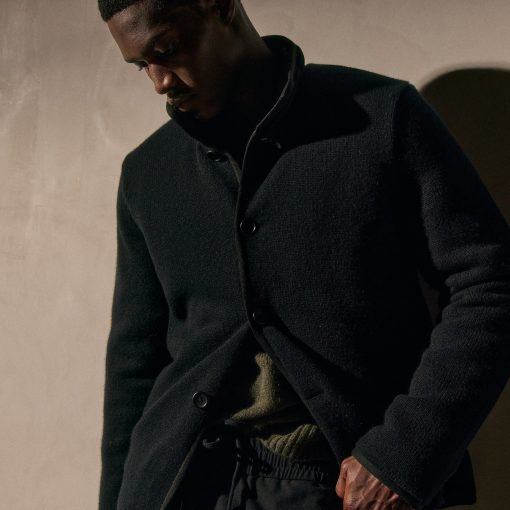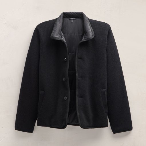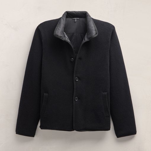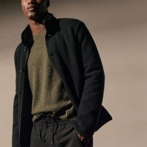 Made from recycled cashmere fibers. Knit with multiple ends creating a lofty, more luxurious hand feel. Button front closure. Suede outer collar. Front welt pockets. Quilted lining.
