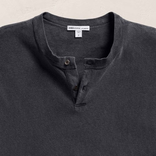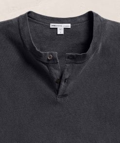 Made in Japanese jersey that is soft with a lofty gauze effect, it has natural slub with high’s and low’s. Binded crew neck, short sleeves, two button placket and raw edge bottom & sleeve