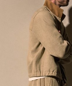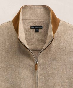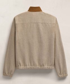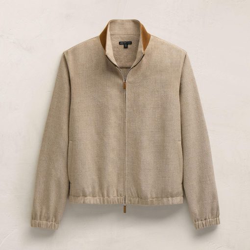 Italian fabric. Suede outer collar. Two way metal zipper with leather pull. Elasticized hem and cuff. Welt pockets.