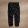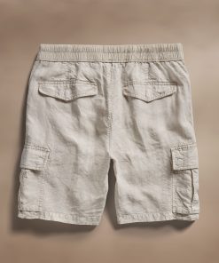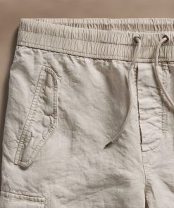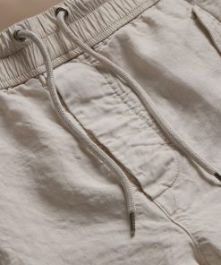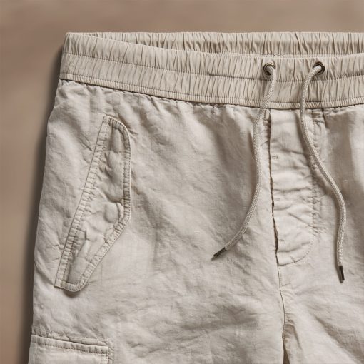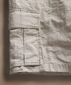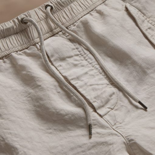 Made from an Italian linen fabric with visible texture. Front flap pockets, pleated cargo pockets at sides, two back flap pockets. Contrast poplin waistband with drawcord, functional button fly and drawcord