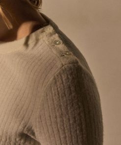 Soft, light, wide ribbed Italian yarn. 3/4 sleeves. Shoulder placket with button closure.