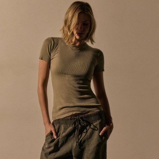 Our Cotton Cashmere Blend Ribbed Crew is made from a super fine, lightweight ribbed Japanese fabric that is soft and luxurious. Details include a raw edge at the bottom opening and sleeve, offering a fitted silhouette.