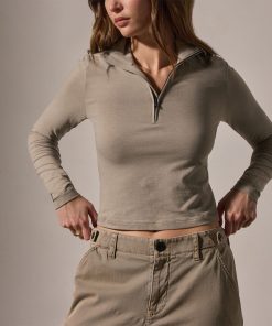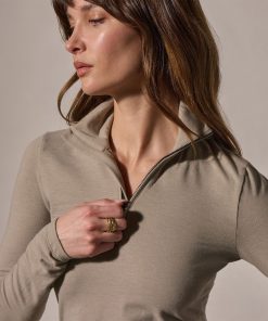Our soft half zip is made from a cotton blend Japanese fabric that has been dyed to give the garment extra texture and an extremely soft hand feel. Style is fitted to the body but the blended fabric offers stretch. Style details include clean, soft hand, funnel neck. Fitted.