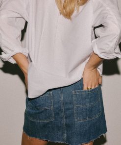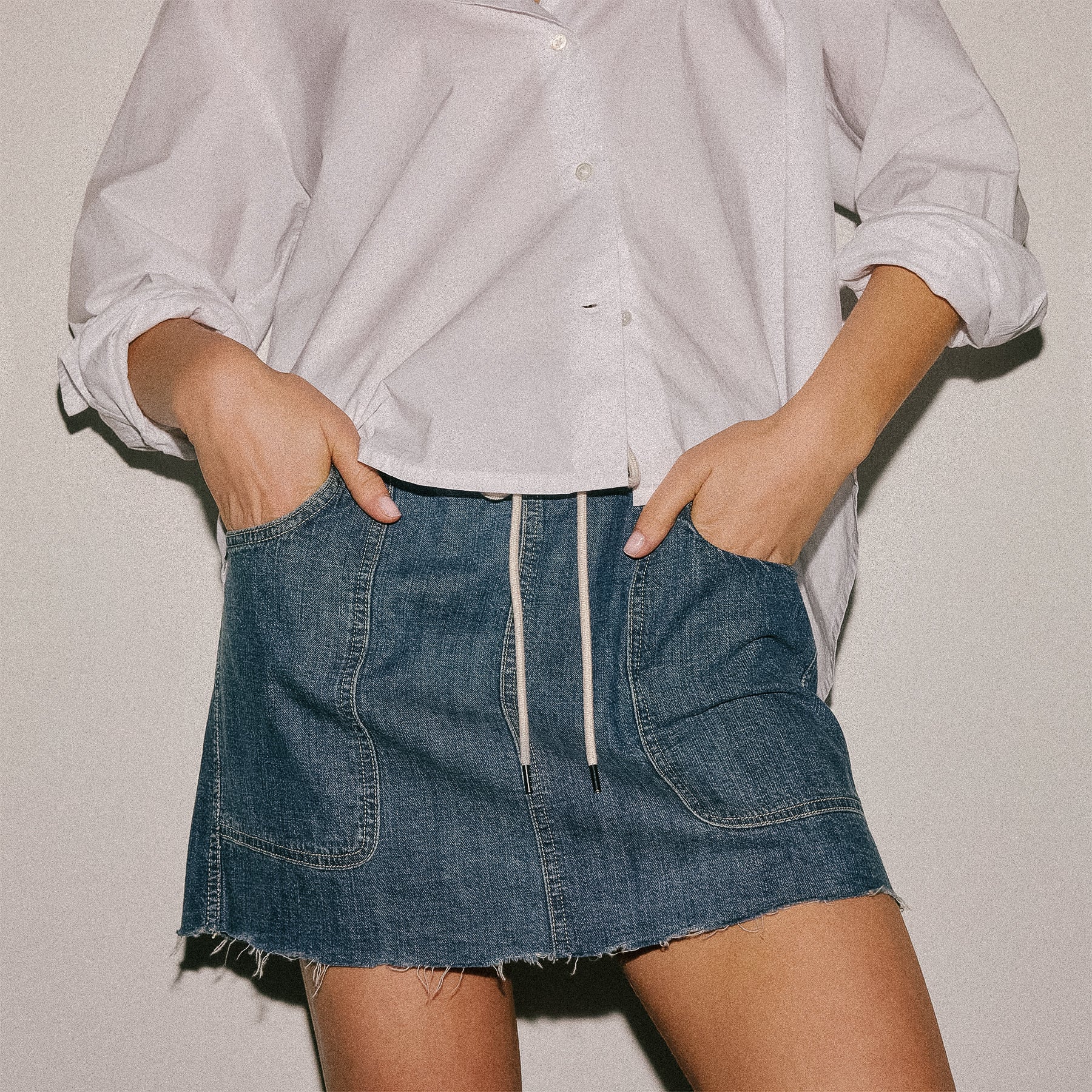 Made of Italian denim and features our signature elasticated waistband with drawcord and belt loops. Front patch pockets and two back pockets, raw edge hem