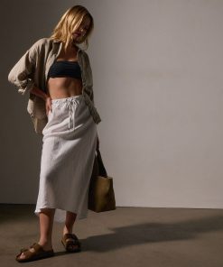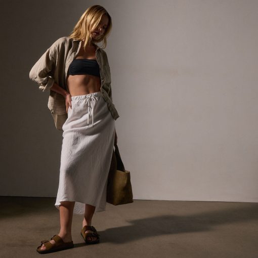 Our High Low Linen Skirt is made in our classic lightweight linen that is breathable and soft. Style details include self waistband with drawcord, slightly high low hem, clean finished hemline and cut on the bias for a flattering fit. Garment dyed.