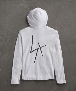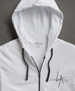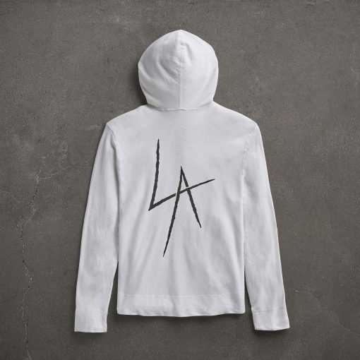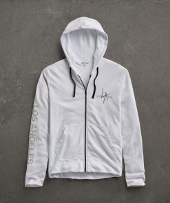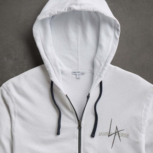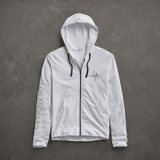 JP x LA relaxed fit French Terry Zip Hoodie with drawcord hood, full zip closure, full-length sleeves and kangaroo pockets. Features graphics of James Perse x Local Authority on left chest, large-scale Local Authority on back and Los Angeles on right sleeve. Our lightweight Supima cotton terry is garment dyed and treated for softness, yielding a lived-in feel.