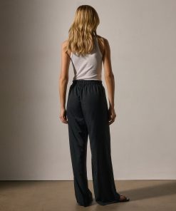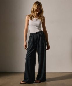Made from a luxe Japanese fabric. Wide, full-length leg shape, on seam pockets. Paperbag waistband with self drawcord
