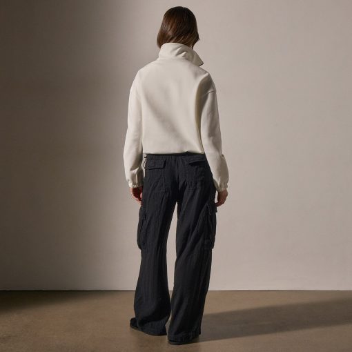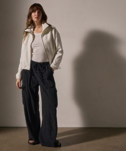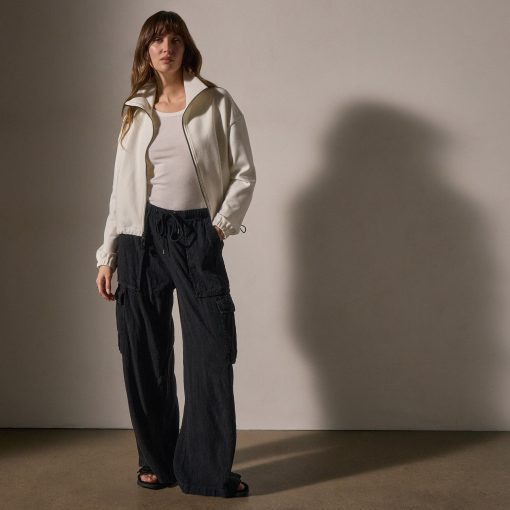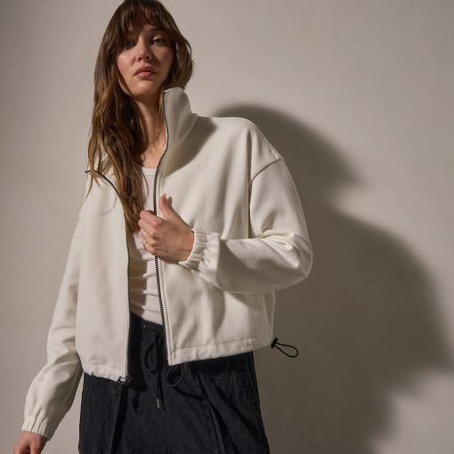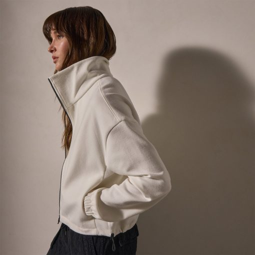 Our Matte Scuba Zip Up is made of brushed scuba fabric from Italy. Style details include functional waist bungee, elastic cuffs, exaggerated funnel neck, zipper pull. Cropped fit.