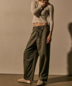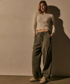 Italian cotton slub fabric. Functional fly and drawcord at waistband. Adjustable side tabs at waist. Front and back patch pockets.