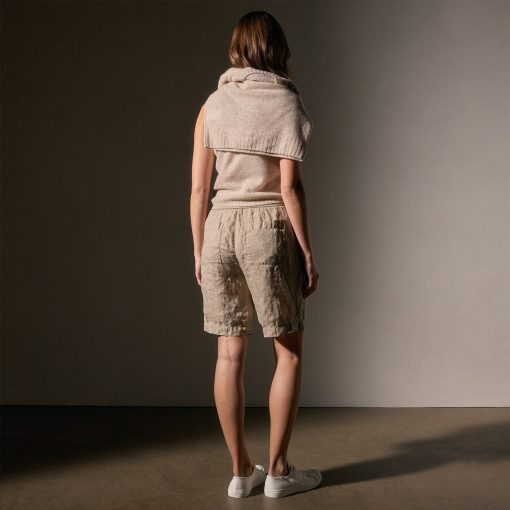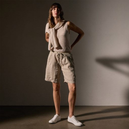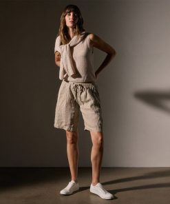 Our Pleated Linen Bermuda Short is made in our classic lightweight linen that is breathable and soft. Style details include narrow jersey waistband with drawcord, front pleats, slash front pockets, and a clean bottom hem. Garment dyed. Relaxed fit.