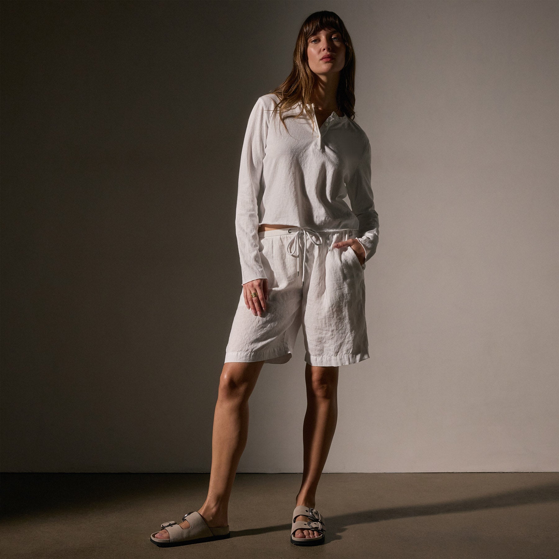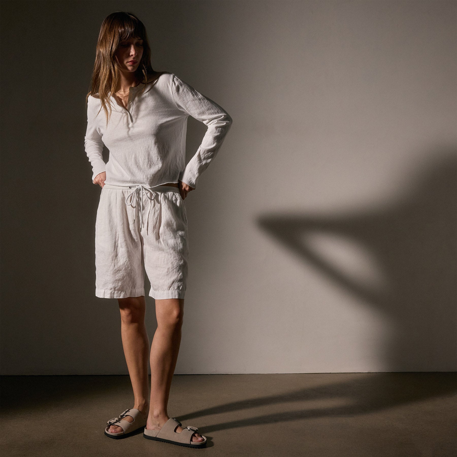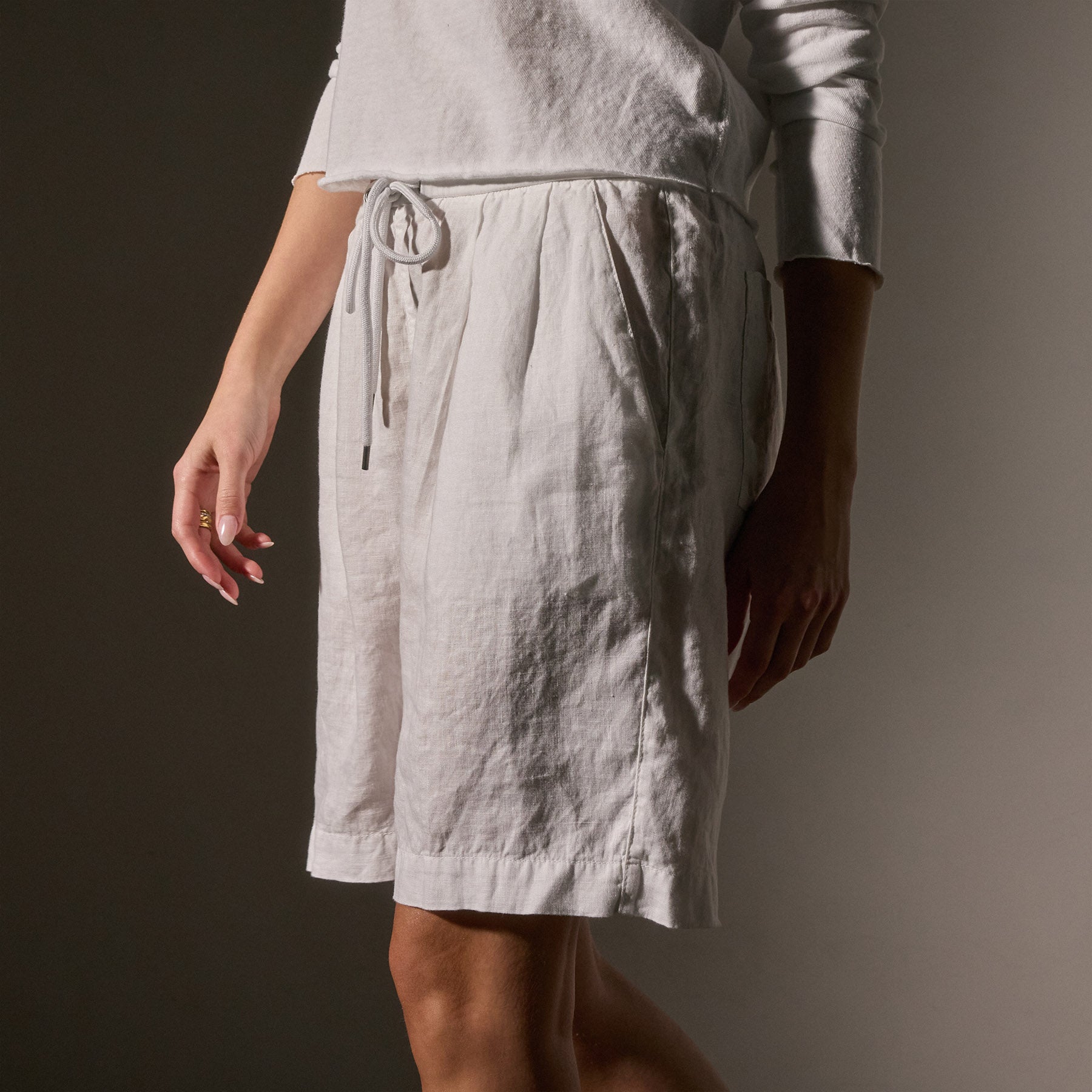 Our Pleated Linen Bermuda Short is made in our classic lightweight linen that is breathable and soft. Style details include narrow jersey waistband with drawcord, front pleats, slash front pockets, and a clean bottom hem. Garment dyed. Relaxed fit.