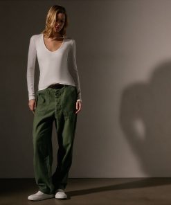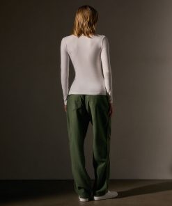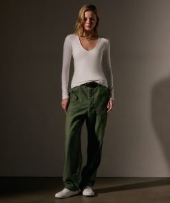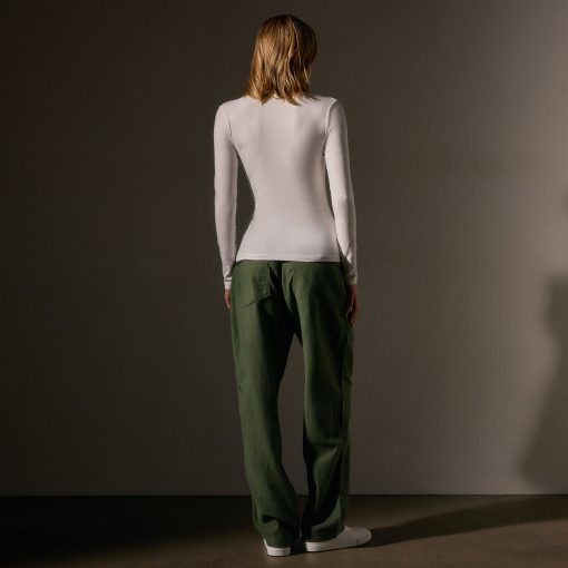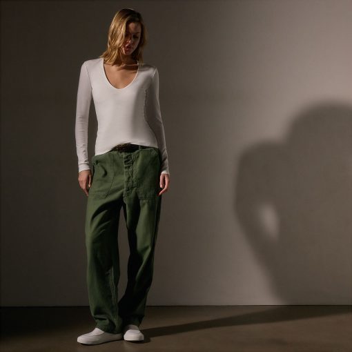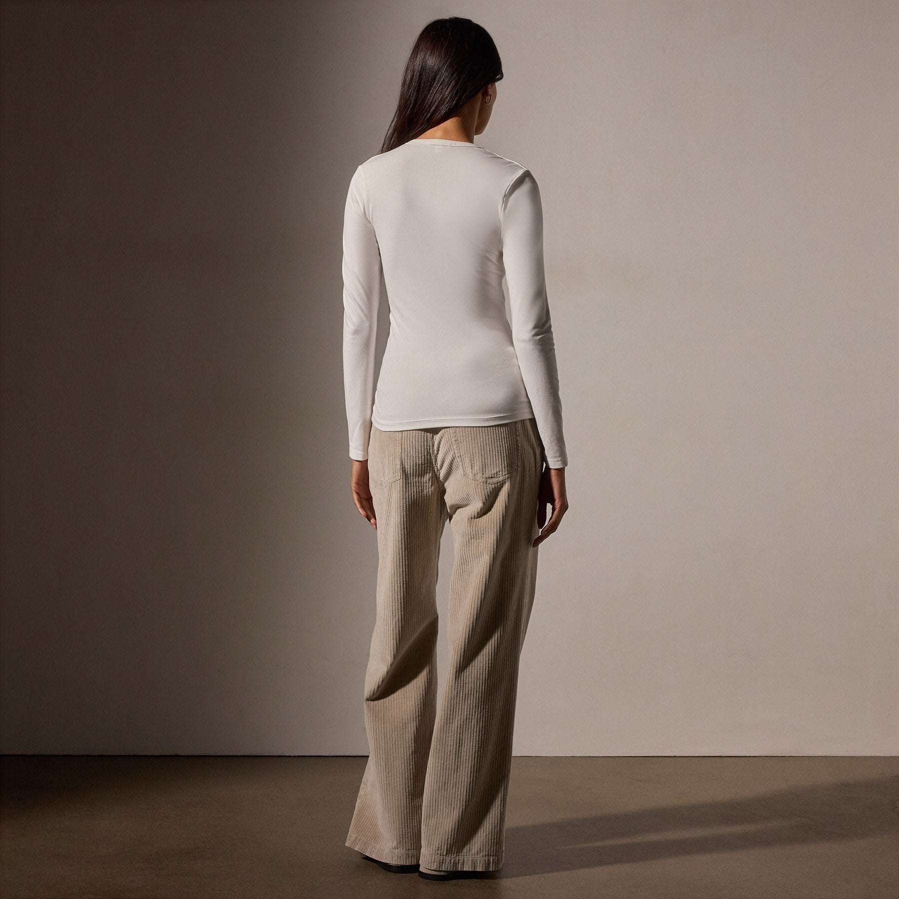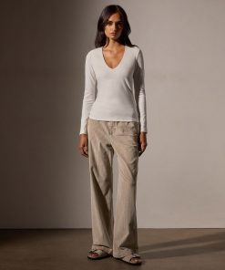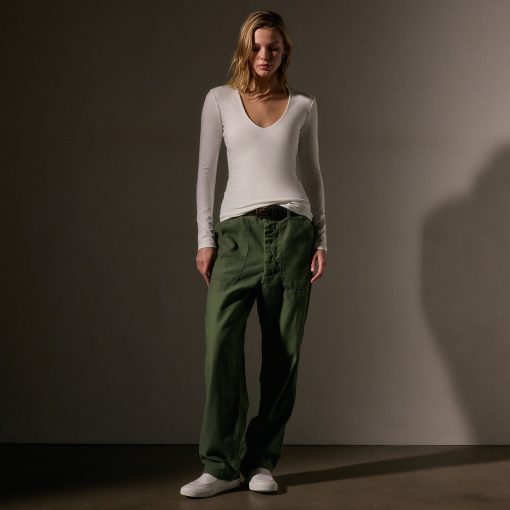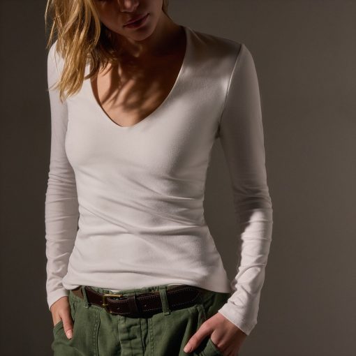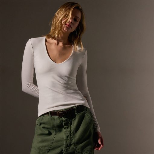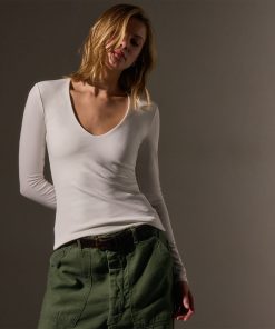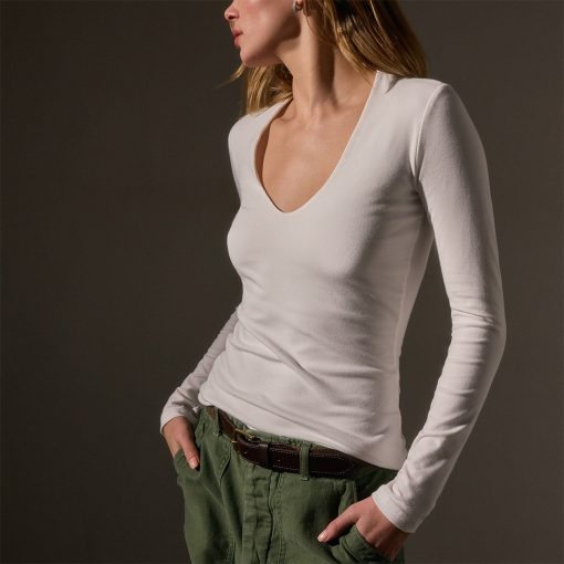 The Stretch Lotus Deep V Tee is knit using the same lotus cotton as our ELJ tops but has added stretch and a fine rib. The double layer front gives a clean neck line and reverts back to the first ever James Perse women’s shirts. It is Japanese fabric made in the USA. Fitted.