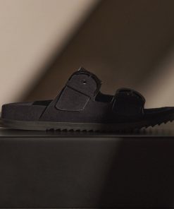 Our Suede Buckle Slide features novelty buckle closures. This sandal is set on a molded supportive footbed for comfort and wrapped in suede.