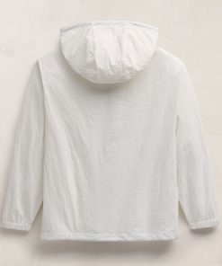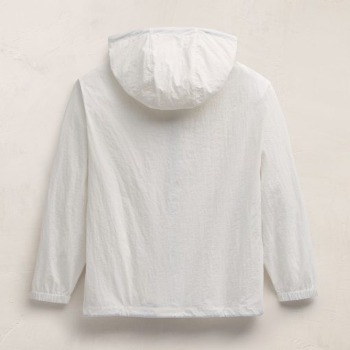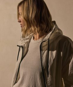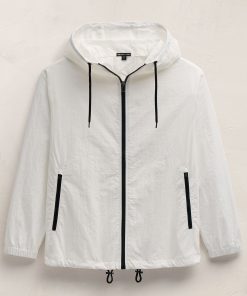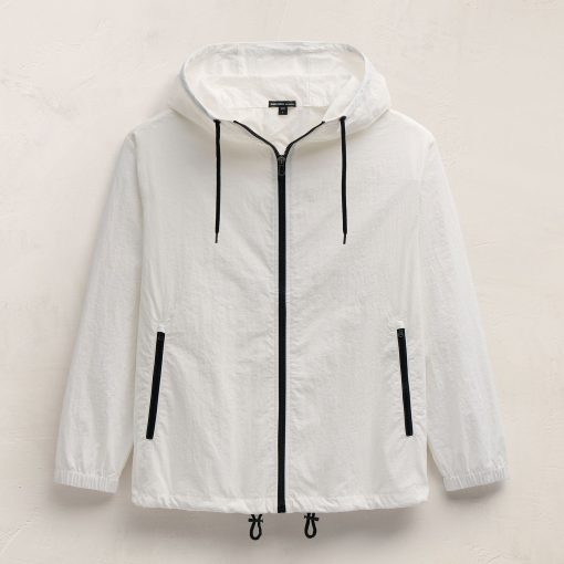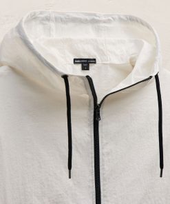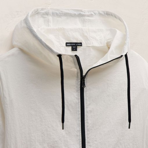 Italian fabric. Exposed front zipper. Zip side pockets. Relaxed shoulder. Drawcord at hood and bottom waist.